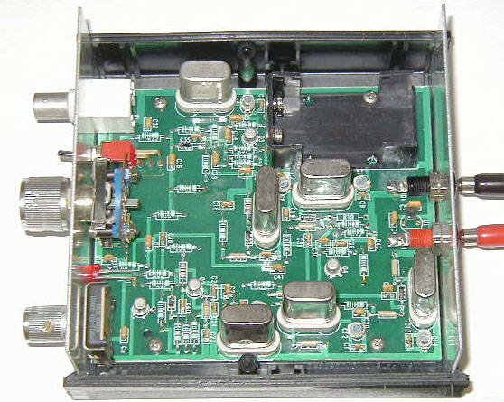 内部の様子・・HC-6/u水晶を使用しています。 右上の四角の黒い部分は、OO6P / 9V電池用ボックスです。