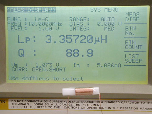 巻き終わったコイルの実測 3.35μH Q=88.9 10MHzにおいて