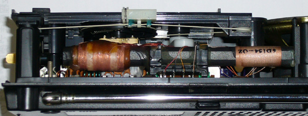 内部の様子 バー・アンテナの白い巻線は、外部アンテナからの信号の結合用です。