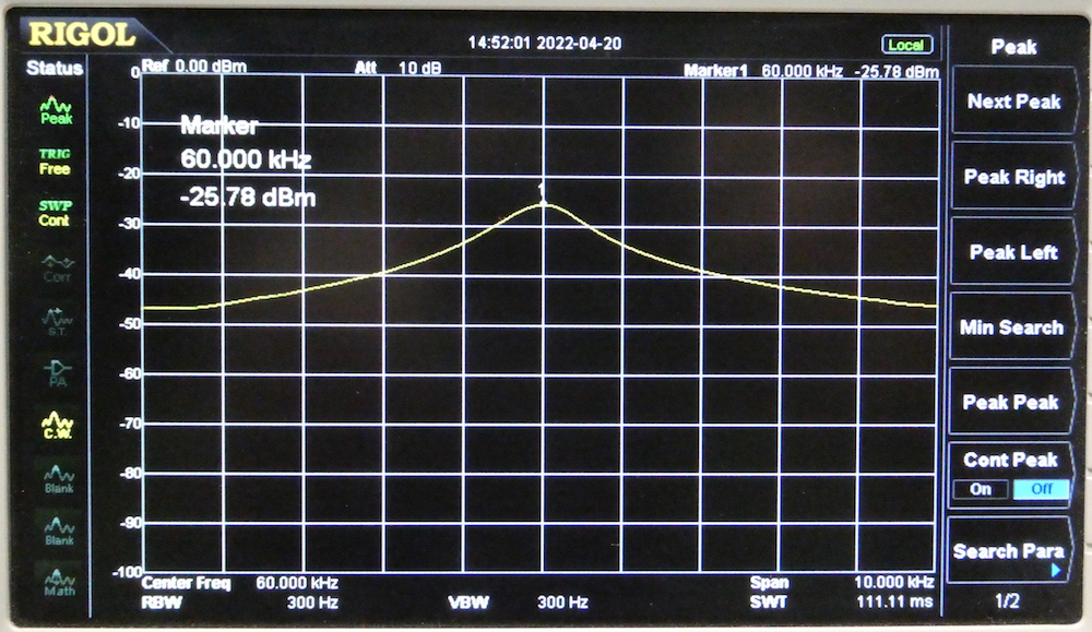 スペアナで合わせる場合はスパン幅を1kHz程度まで狭くしてください。