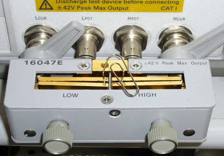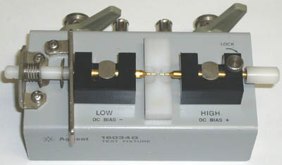 Agilent 16047E 治具に取り付けて測定している様子です。