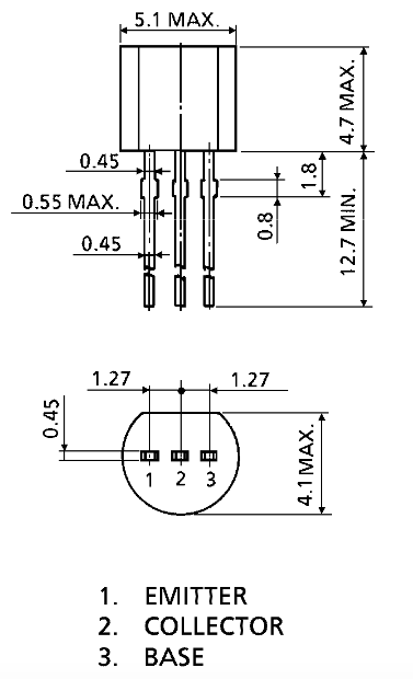 トランジスタの極性図 型名がある面を正面にして左から E C B になります。