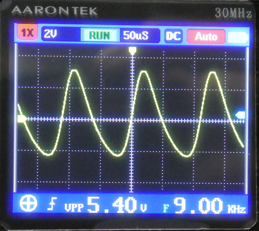 2、数十秒後に9kHzの振動音が聞こえる。(発振するまでの過程はオシロスコープを併用して観測できる。)