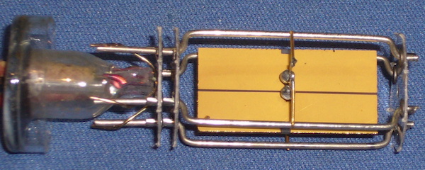 写真3 100kHz水晶振動子の中身 振動子の両面が2分割されています。