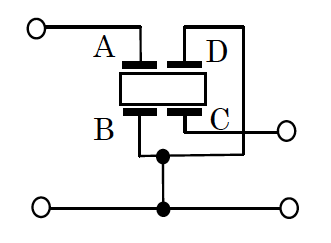 日本大学理工学部 作田先生の文献では端子ACと端子BDを一緒にし2端子とすることにより,通常の水晶振動子の等価回路となると記載されています。
